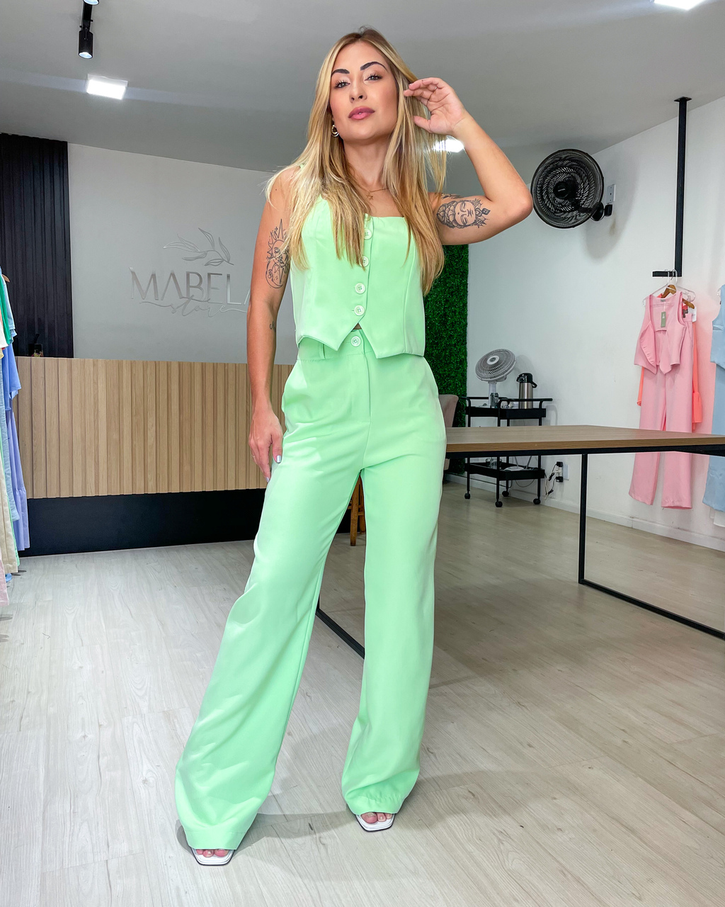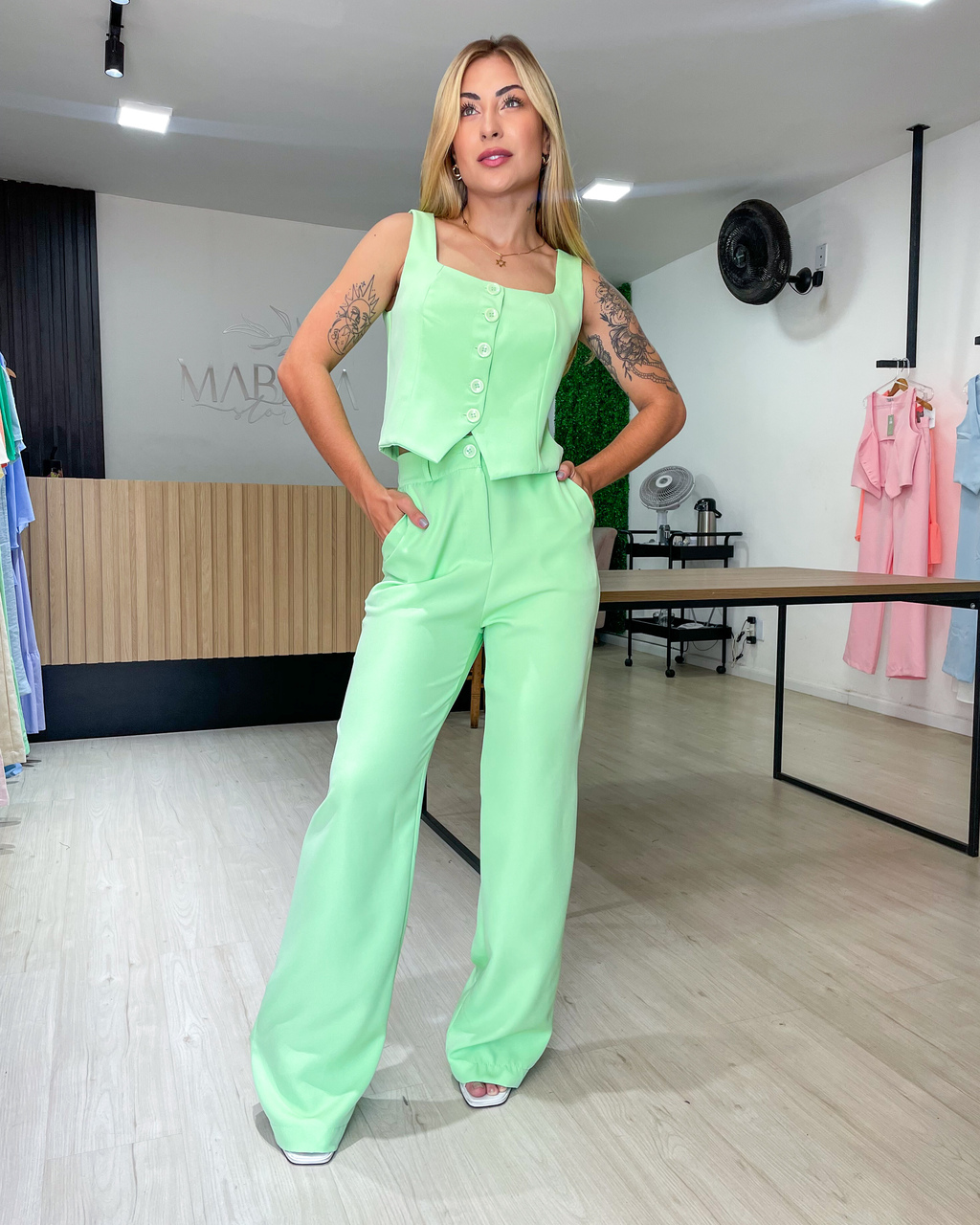 A calça modelo de cintura alta complementa o look, com passantes e bolsos funcionais que oferecem praticidade. O fechamento em zíper e botão garante um ajuste perfeito.